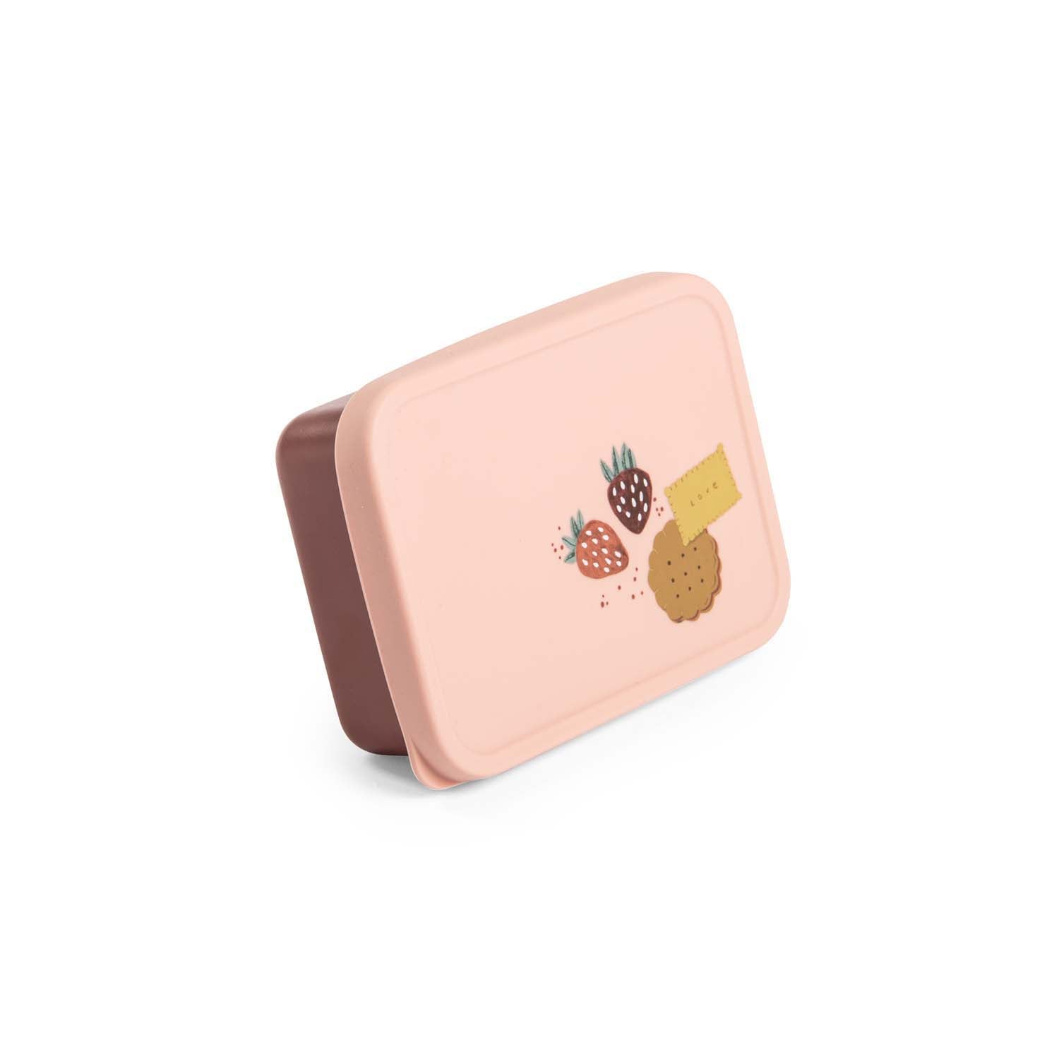Fin madkasse i rustfrit stål med silikonelåg i rosa nuancer, prydet med charmerende illustrationer fra serien Après la pluie. Den tætsluttende lukning gør den ideel til snacks, frugt eller en lille madpakke på farten. Madkassen har en praktisk størrelse, så den let kan være i skoletasken.