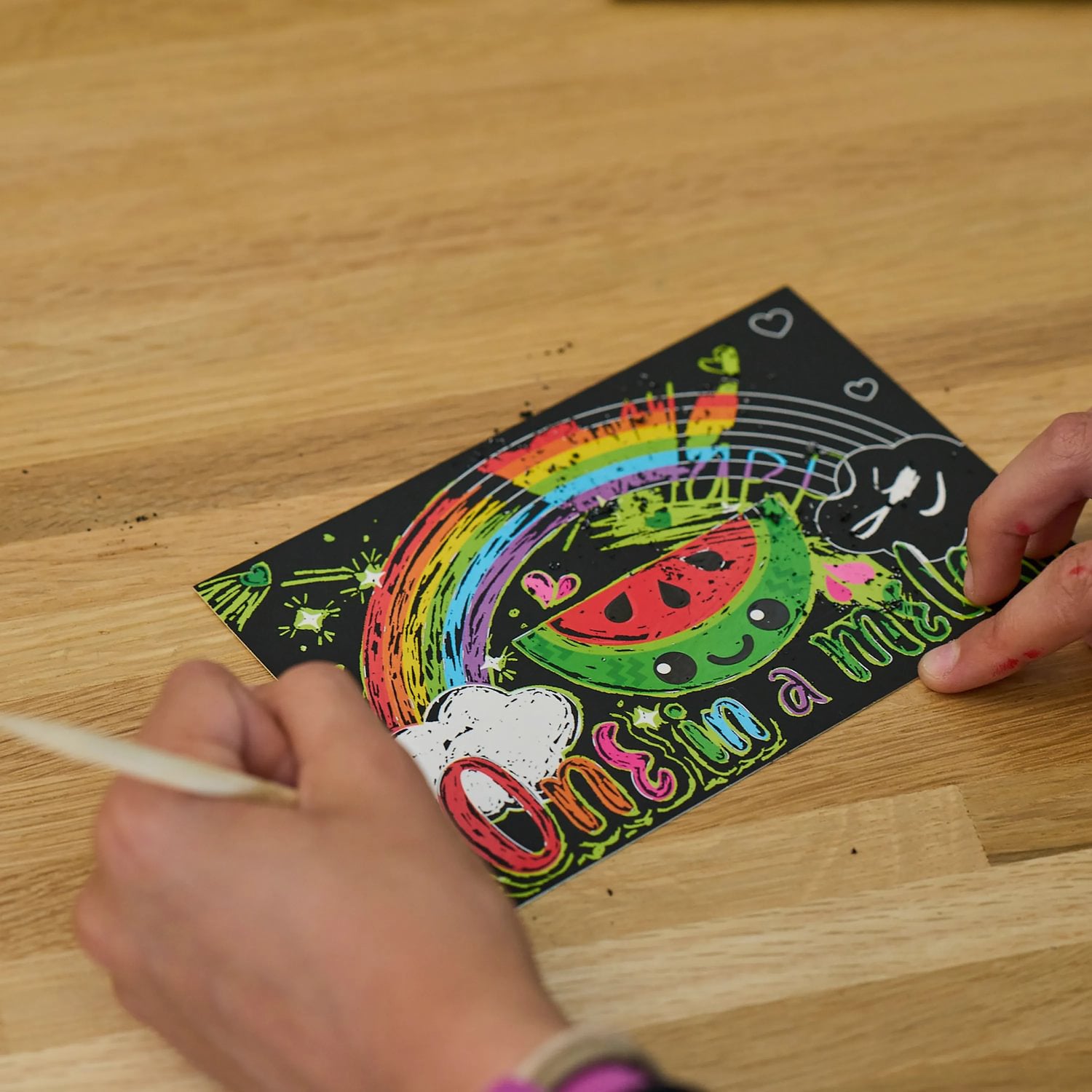 2 regnbuefarvede blanke ridsekort (10 x 15 cm): Her kan fantasien få frit løb, og dit barn kan skabe helt unikke mesterværker.