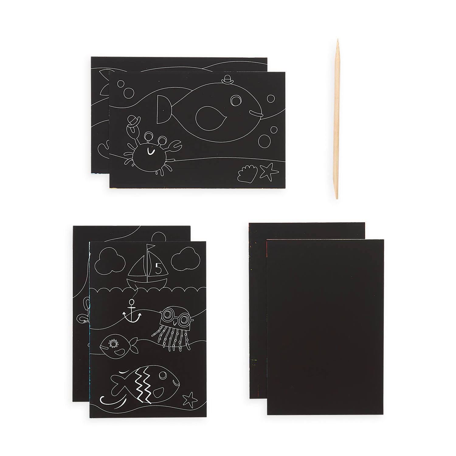 • Sættet indeholder 4 illustrerede skrabekort (10 x 15 cm), 2 regnbuefarvede blanke skrabekort (10 x 15 cm) og 1 træskraber