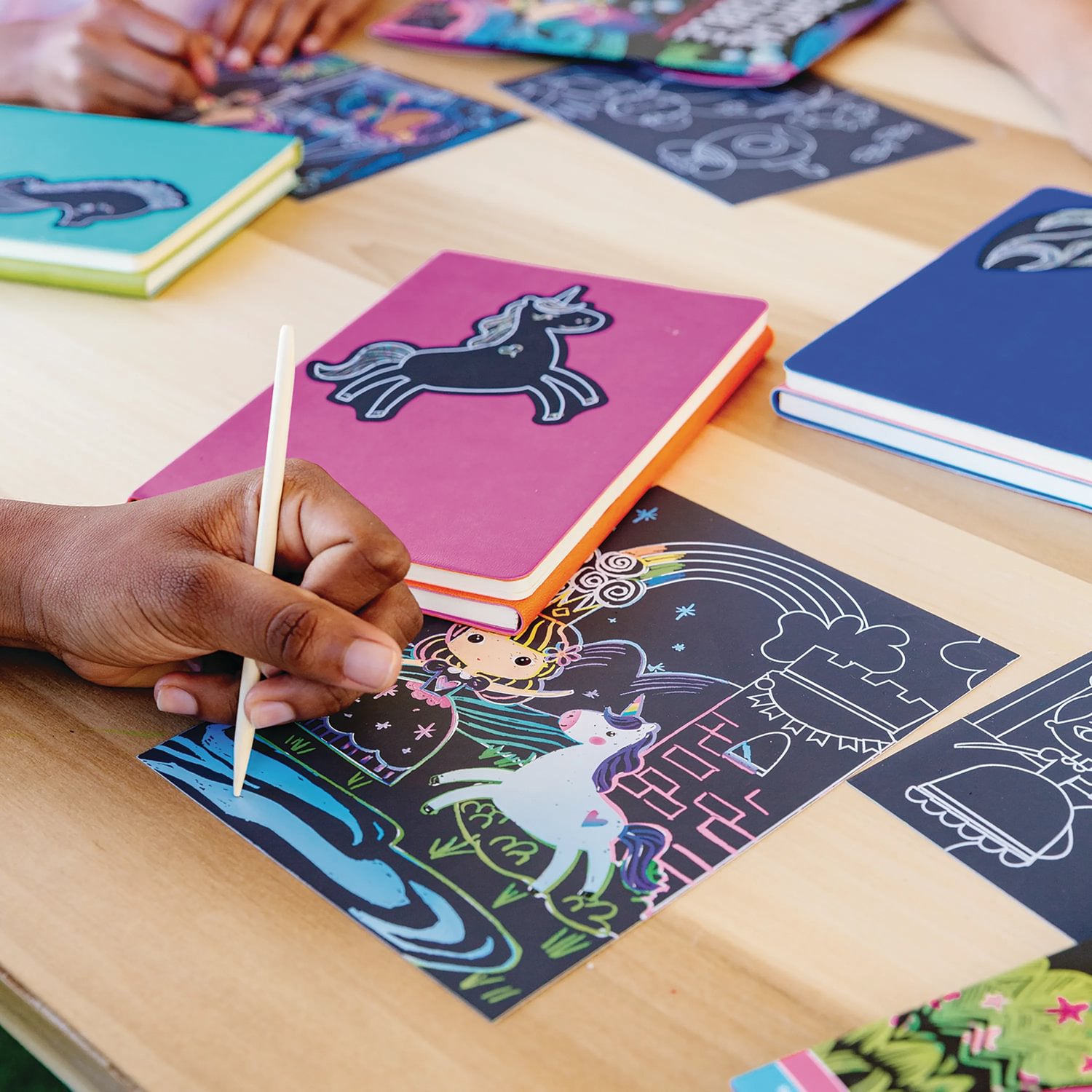 Sættet indeholder 4 illustrerede ridsekort (15 x 21 cm), hvor skjulte prinsessehaver venter på at blive afsløret. Derudover får du 2 regnbue- og 2 glitrende blanke ridsekort (15 x 21 cm), som giver frie tøjler til fantasien. Tilføj et ekstra strejf af magi med det medfølgende ark med glitrende klistermærker (20 x 20 cm), og brug træskraberen til at bringe kunstværkerne til live. De illustrerede vejledninger gør det nemt for børn at komme i gang, og de kan endda tilføje deres egne mønstre for at skabe et helt unikt mesterværk. Perfekt til kreative projekter, skolearbejde eller bare en hyggelig stund med kunst!