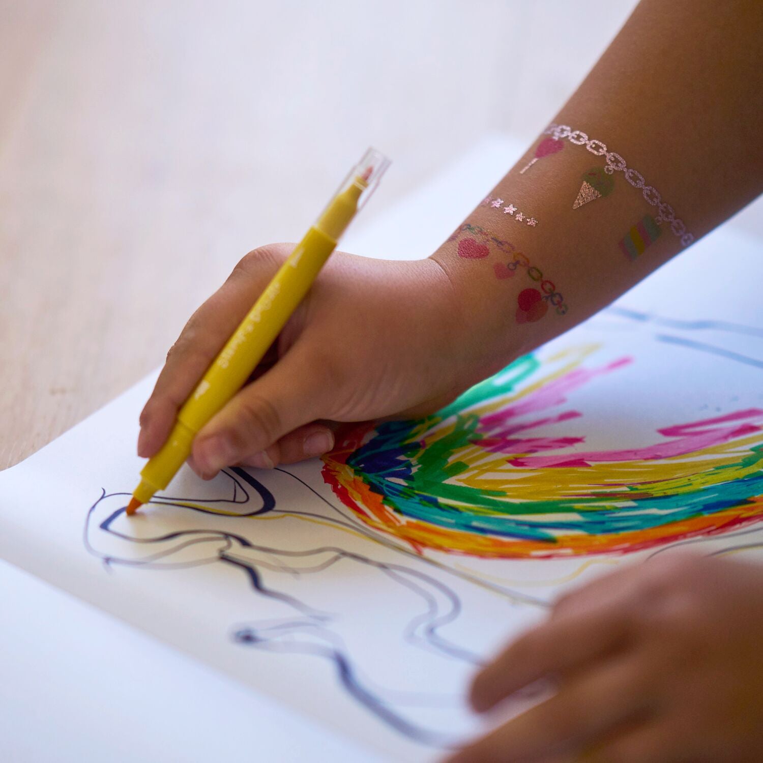 Hver tuspen er dobbeltsidet og udstyret med en alsidig mejselspids, perfekt til at lægge brede, dækkende farver, samt en præcisionsspids, der gør det nemt at tilføje de fineste detaljer og skarpe linjer. Men det er ikke alt! Dette sæt gemmer på en helt særlig overraskelse: tre farveskiftende tusser. Disse unikke tusser har en almindelig spids i den ene ende og et charmerende stempelmotiv i den anden.